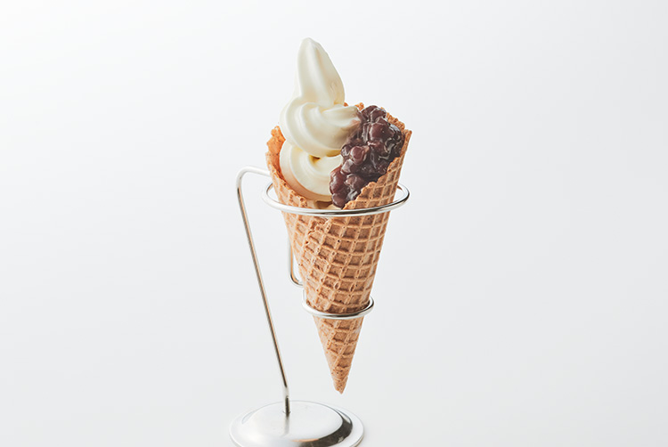 小豆皮をくわえたワッフルコーンにすっきりとした口どけのソフトクリームをしぼり、瑞々しく甘さ控えめに炊き上げた粒餡を添えて仕上げました。