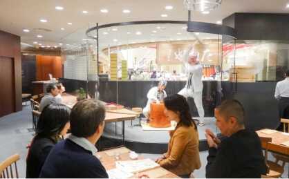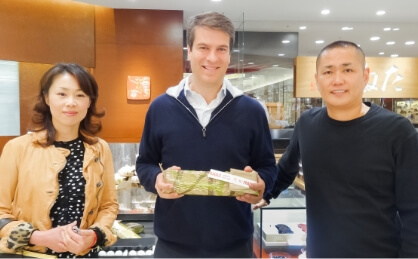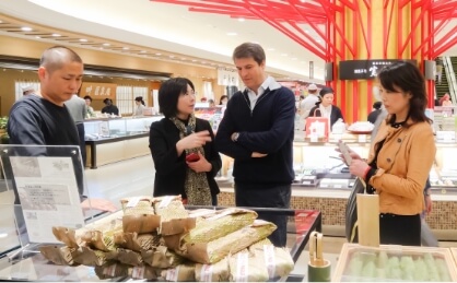 たねや茶屋 うめだ阪急店にて、搗きたてのお餅にオリーブオイルをかけていただく当店の看板メニュー「オリーブ餅」を試食。餅搗きのパフォーマンスを間近で体験し、日本古来の伝統とイタリアのエッセンスが融合しているさまに、大いに感激されていました。