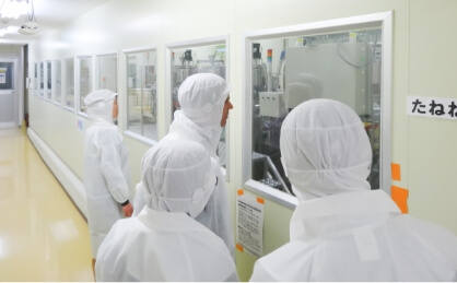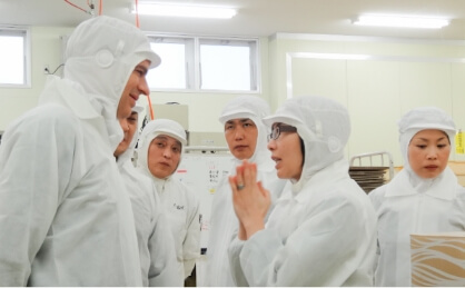 たねや愛知川工場をご案内。たねやグループの本生製法を実現するクリーンルームの充填技術と、日本のハイレベルな衛生管理に刺激を受けておられました。