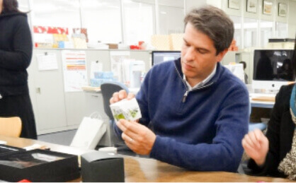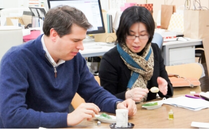 オリーブ大福につづく新商品を試食。笑顔で一言「Buono!(おいしい!)」。近日中に商品化されることが決まりました。