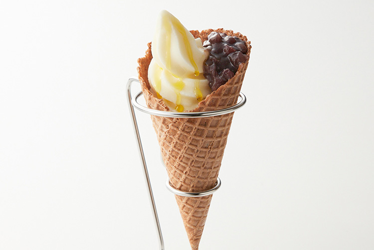 小豆皮をくわえたワッフルコーンに、ソフトクリームをしぼり粒餡とオリーブオイルをかけ仕上げました。